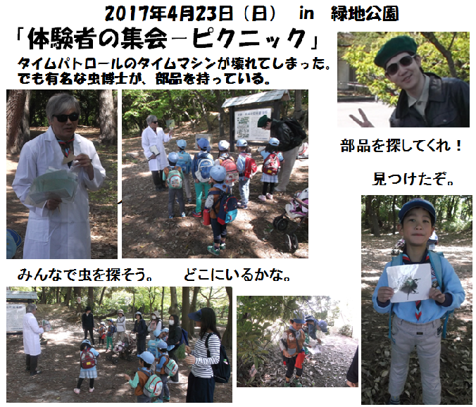 服部緑地公園で、「回転花壇の妖怪大作戦」が行われました。最初に「ウィスパー」が現れました。泣いてしまった子がいたらしいけど、やさしいウィスパーですよ。準備運動には、かわいいリーダーと妖怪体操をしたよ。さあ、妖怪を探しに行こう。