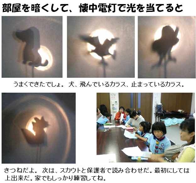 登場人物が完成しました。うまく影絵ができるかテストです。部屋を暗くして懐中電灯で試してみました。できた、できた。次の準備は、読み合わせです。リーダーと保護者が読み合わせるとスカウトは、楽しそうに笑っていました。これはいけそうだ・・・。さて、本番の配役は、スカウトと保護者にしてもらうことにしました。スカウトは、初めてのシナリオをたどたどしく読みましたが、練習すればうまくできそうです。これは、楽しみですよ。