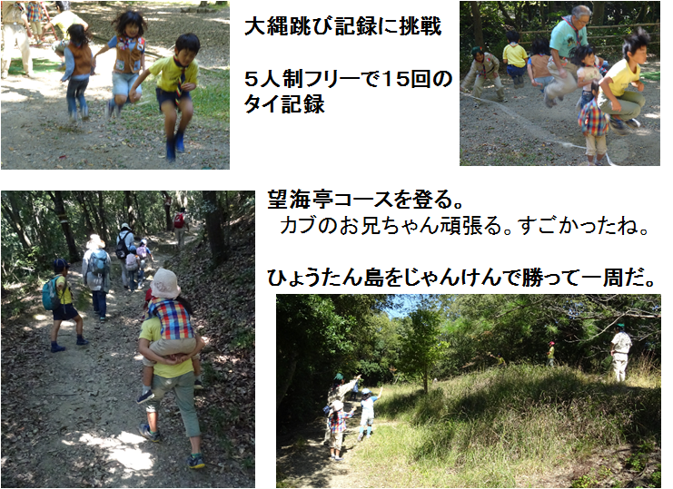 9月3日に服部緑地公園で自然の観察をポイントハイクで楽しみました。わっぱるで現れた「森の神様」が来てくれました。「もっと自然を知って、自然と仲良くなろう」。どんぐり、まつぼっくり、セミのぬけがら、ノウゼンカズラを見つけよう。自然観察のビンゴカードを持って出発しました。ポイントで緑地公園の博士がでてきて、「落ち葉じゃんけん」をしながら、落ち葉の観察をしました。落ち葉爆弾を大輪で回すゲームでは、団委員長が大当たり。スカウトでなくてよかった。