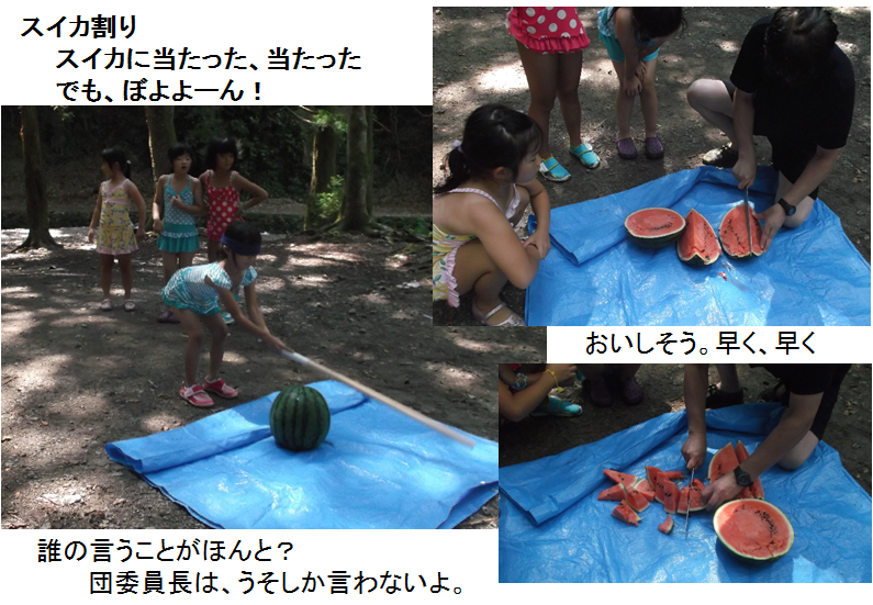 7月12日と13日の舎営で、スカウト4名、保護者5名、兄弟姉妹5名、リーダー8名(隊ー白崎、川辺、藤丸、下村蛍輔、団ー浜嶋、吉田、大田、寺町)、全体22名で、団行事「夏祭りわっぱるでわっしょい」を楽しみました。
