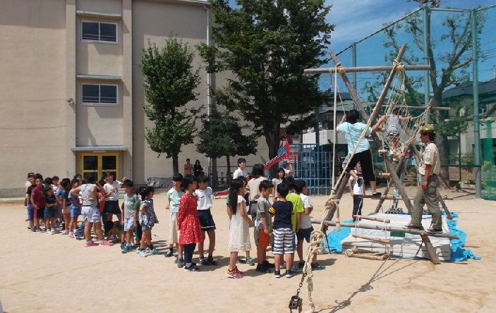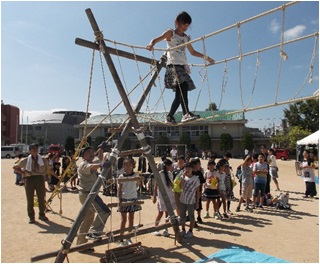 第3中学校、桜塚小学校、などでモンキーブリッジを楽しんでもらっています。桜塚地区の体育祭は支援団体として手伝っています